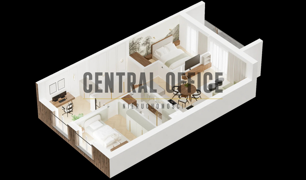 Funkcjonalny układ zapewniający komfortową strefę dzienną oraz trzy oddzielne pokoje, które mogą pełnić funkcję sypialni, gabinetu lub pokoju dziecięcego.